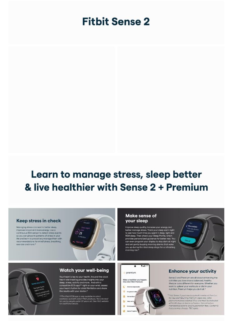 On the main Fitbit store page, the Sense 2 is listed in a box that cannot be clicked. The smartwatches product page lists details about the wearable, but the space where pricing should be is gone.
