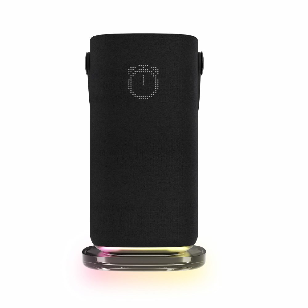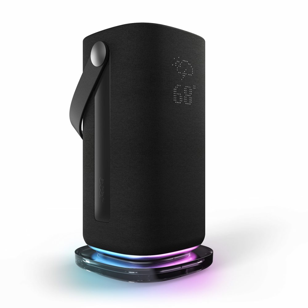 The signature design traits of the Halo Swing, quite literally lending the speaker its name, are the convenient leather carrying handle and the customizable RGB lights on the underside. Those lights react when you invoke the Google Assistant and can also be customized in the Acer Halo app. On the front of the speaker, you’ll find a simple LED display, which can show things like the current weather, calendar, and more, or be hand-drawn in the app.