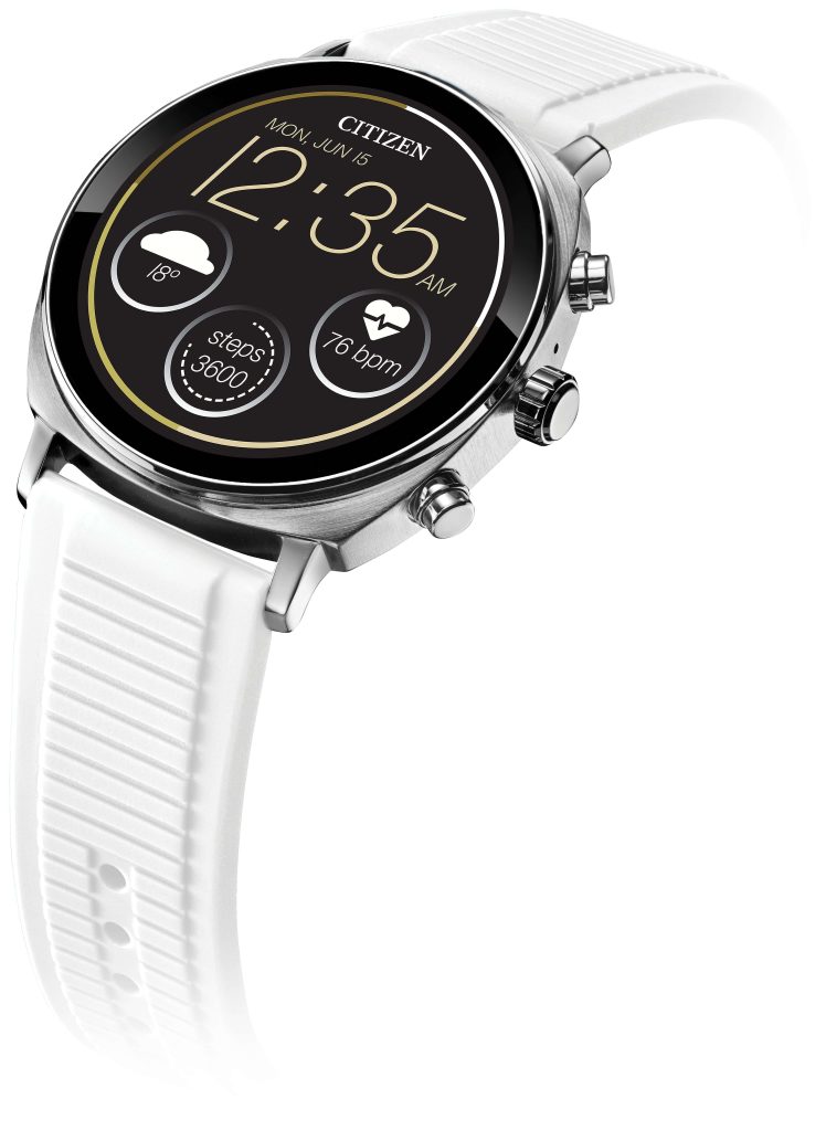 Running the latest version of Wear OS (3), the Citizen CZ Smart watch is compatible with both Android and iOS. Pre-loaded apps include Amazon Alexa, Google Fit, Spotify, Strava, and YouTube Music.
