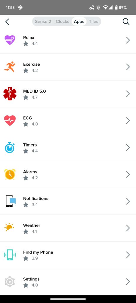 Original 1/7: At launch, the “Apps” tab of the “Gallery” on the Sense 2 and Versa 4 only featured Fitbit-made apps: EDA Scan, SpO2, Relax, Exercise, ECG, Timers, Alarms, Notifications, Weather, Find my Phone, and Settings.
