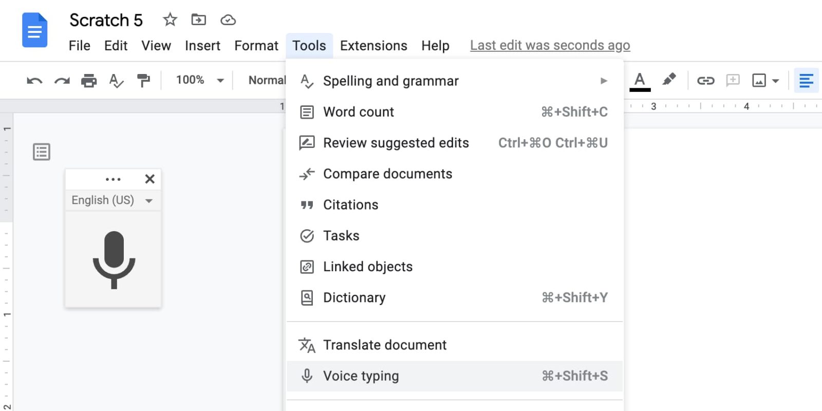 When viewing a Google Doc, Tools > Voice Typing opens a floating microphone that accepts input until you click again. You can also edit and format with your voice.