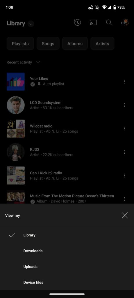 The very first item (View my) in the updated tab lets you switch between Library, Downloads, Uploads, and Device files. Another way to quickly pull up that sheet is by double-tapping that tab in the bottom bar. Compared to the design that rolled out last year, History has been elevated to the app bar next to Cast, so you no longer have to open your account menu for a list of recent tracks.