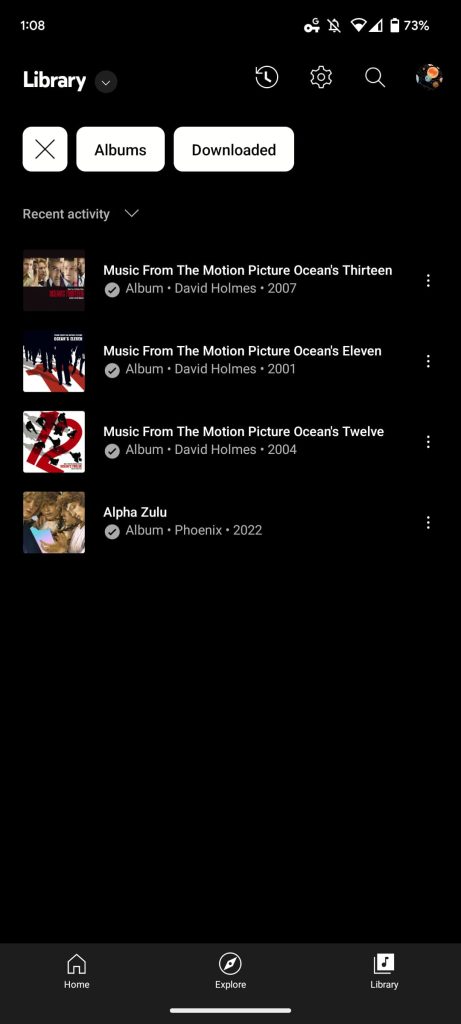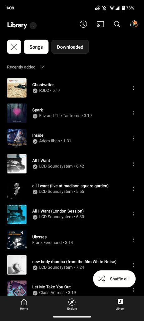 You then get a row of chips for Playlists, Songs, Albums, and Artists to filter through the list that makes up the rest of this page. Selecting the first three choices will show a new Downloaded filter, while Artists is accompanied by one for Subscriptions.