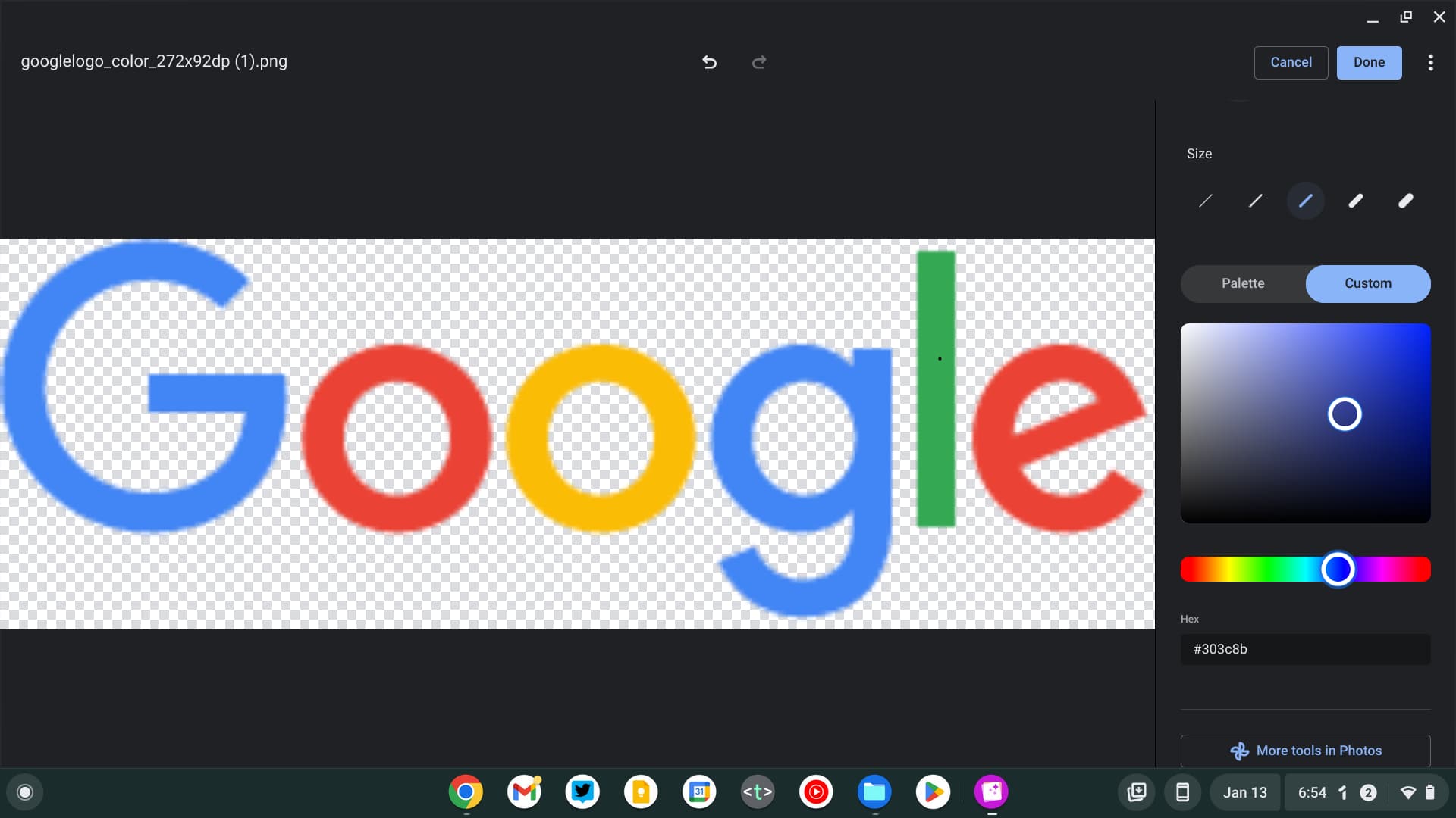 The Gallery’s Annotate feature now has a “Custom” color picker that provides many more options than the 20 presets under “Palette.” There’s a HEX field that lets you be precise.