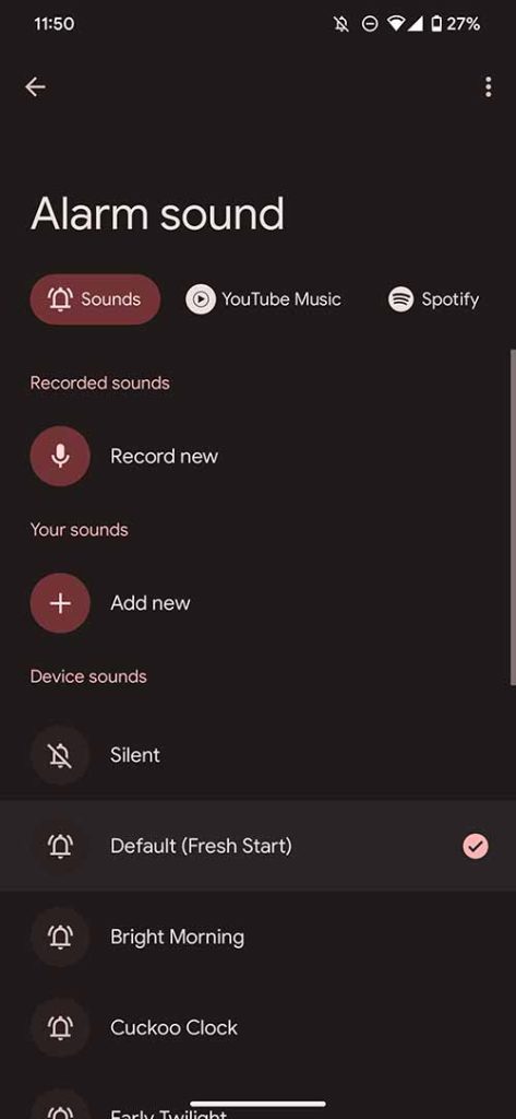 When available on your device, tapping the “Record new” sound button, it’ll actually launch the Google Recorder application. After recording a custom alarm sound, these will appear with a time and date shown in the Google Clock app and also in the Google Recorder application.
