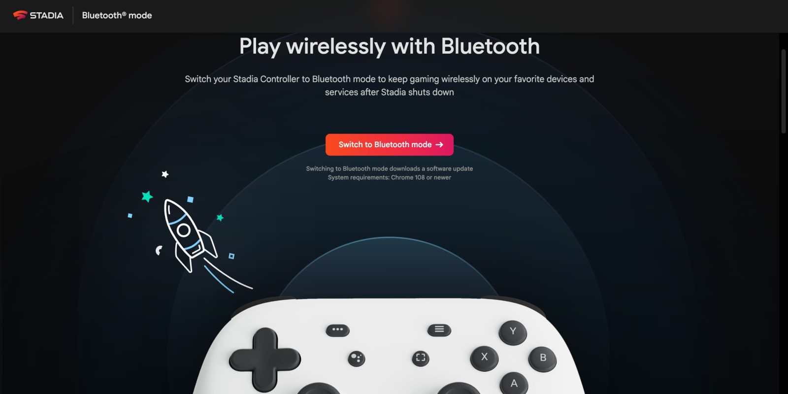 Google has released a “Bluetooth mode” tool at stadia.google.com/controller that requires Chrome 108 or newer. The process “downloads a software update” that is permanent, though that won’t mean anything come January 18.