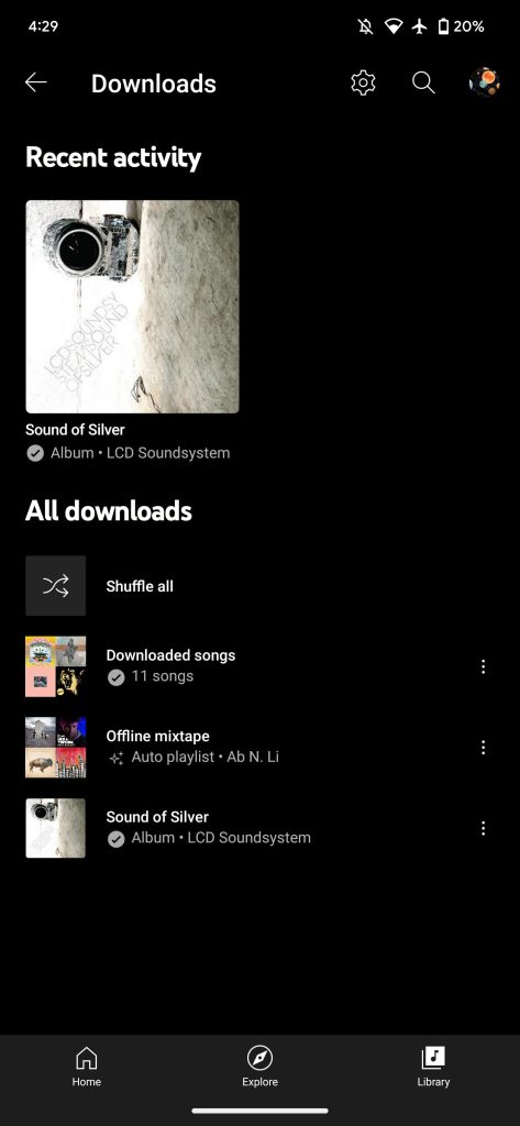 On the Downloads front, you still get a list view, which is accessed by tapping the top-left corner of the Library tab or the bottom bar again once you’re already on that page. You can filter by Playlists, Songs, and Albums, with sort options for Recent activity, Recently added, and Recently Played, instead of just having one long list.