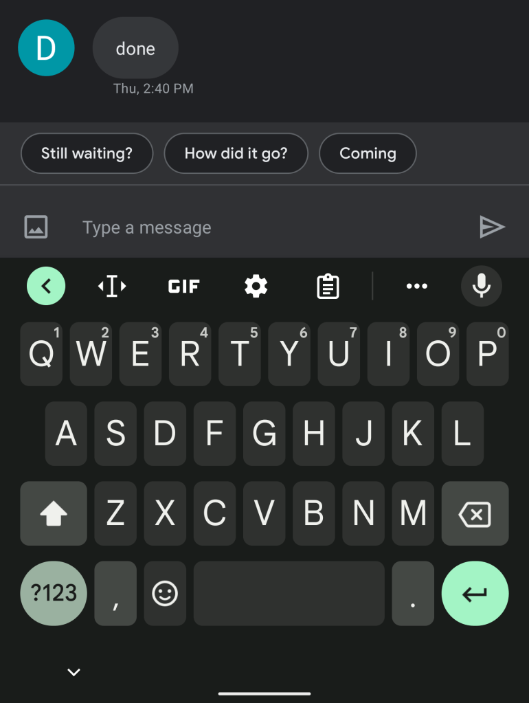 This straightforward feature looked at the last received message and suggested up to three contextual replies. These pills would appear above the “Type a message” field with the Smart Reply immediately sending on tap.