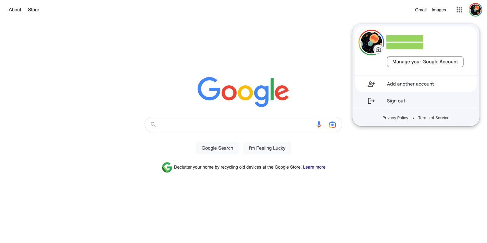 If you’re signed into more than one account, that will appear next with “Add another account,” rounding out the inner container. “Sign out” or “Sign out of all accounts” is part of the background with “Privacy Policy” and “Terms of Service.”