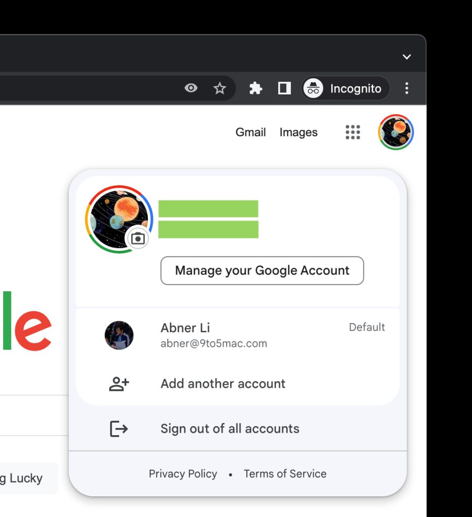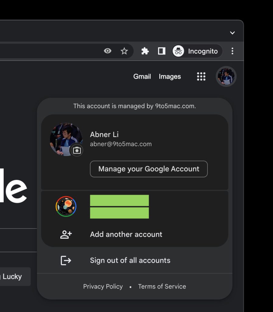 If you’re signed into more than one account, that will appear next with “Add another account,” rounding out the inner container. “Sign out” or “Sign out of all accounts” is part of the background with “Privacy Policy” and “Terms of Service.”