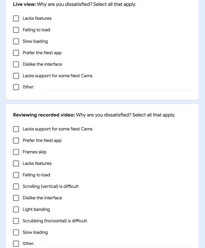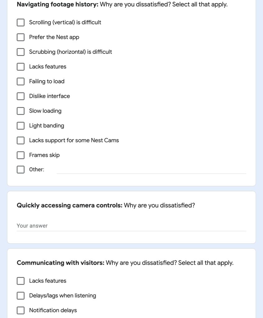 Camera – Details dives deeper with questions about the level of video history you have (No subscription, Nest Aware, Aware Plus), and overall satisfaction with the video experience. You can also go in-depth into why you dislike the Live view, Reviewing recorded video, Navigating footage history, Quickly accessing camera controls, and Communicating with visitors experiences.
