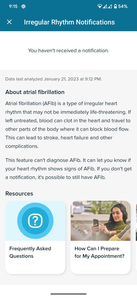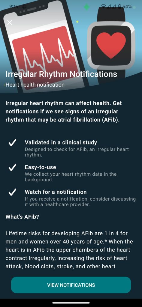 However, some Pixel Watch owners are seeing an Irregular Rhythm Notifications page in the Discover tab of the Fitbit app. It explains the feature, and lets you “View Notifications.” This page notes when data was last analyzed.