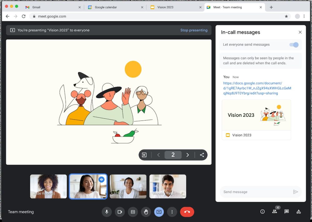 The presentation controller in the bottom-right corner now features a “Share in Meet chat” button. It will also appear as a “suggestion in the Meet Chat.” Attendees will be notified of the share, while a “link to the file will be automatically shared in the meeting chat.”