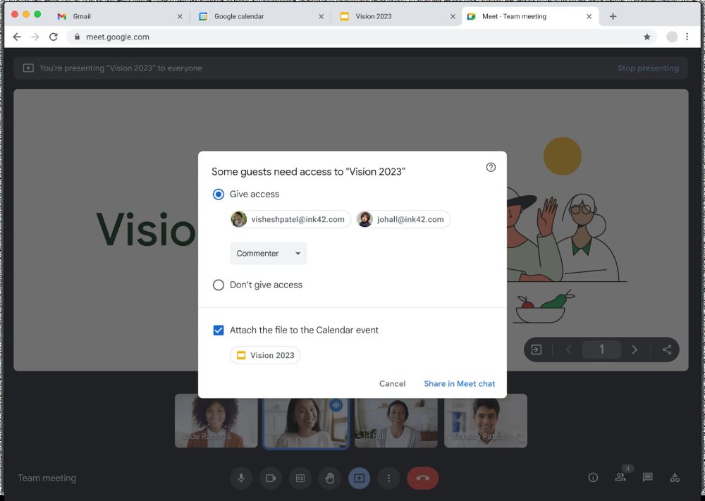 Additionally, when you paste Drive links in Meet Chat, the file access dialog will appear to ensure that all guests have access to it. You can also choose to “Attach the file to the Calendar event.”