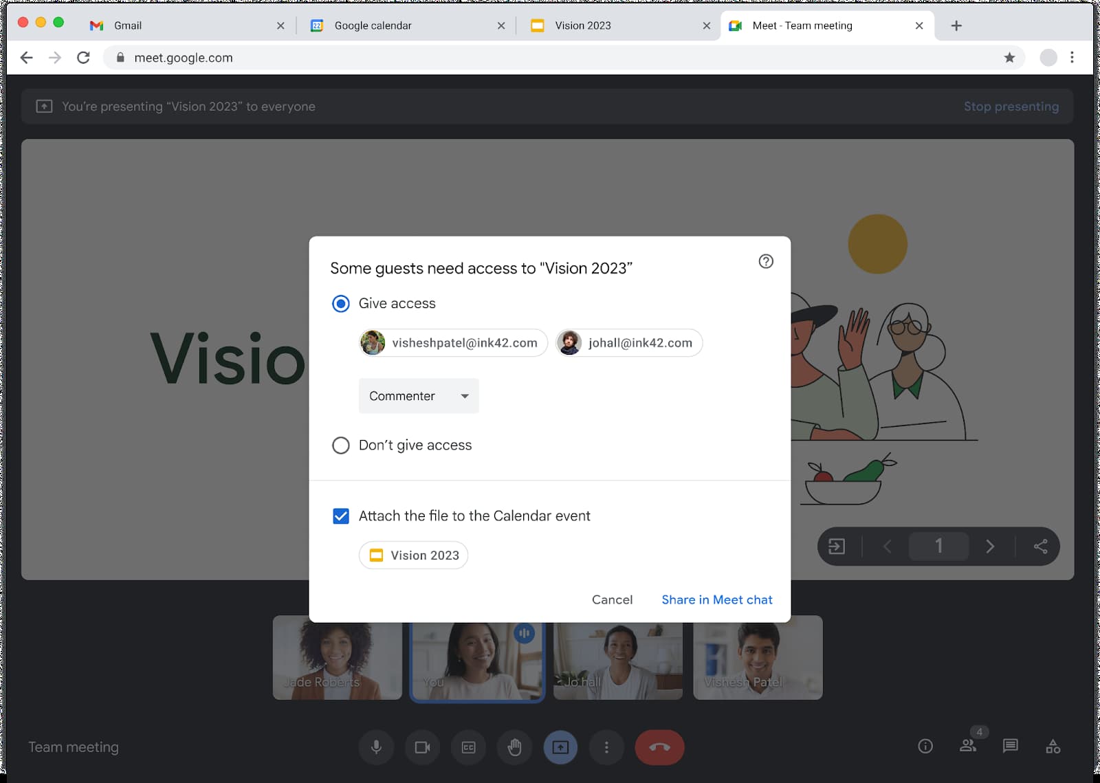 Additionally, when you paste Drive links in Meet Chat, the file access dialog will appear to ensure that all guests have access to it. You can also choose to “Attach the file to the Calendar event.”