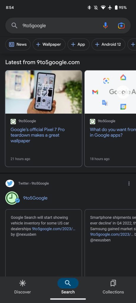 To start with, the Google app now uses a more Material You-aligned bottom bar with pill-shaped indicators, which helps match the new Search filters carousel design. This is the short version instead of the standard tall variant found in nearly every other first-party app, though Gmail uses something even more minimal. Dynamic Color is not used, and you just get a blue accent.