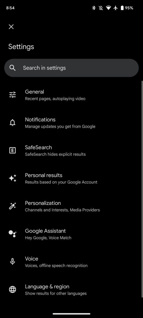 Lastly, Google app Settings have been thoroughly revamped with an AMOLED black background in a dark theme. It looks like other Material You settings, through the header could be larger. Under the pill-shaped search bar, there’s no change to how menu items are organized: General, Notifications, SafeSearch, Personal results, Personalization, Google Assistant, Voice, Language & region, Privacy & Security (which appeared in recent weeks and does not work), and About.