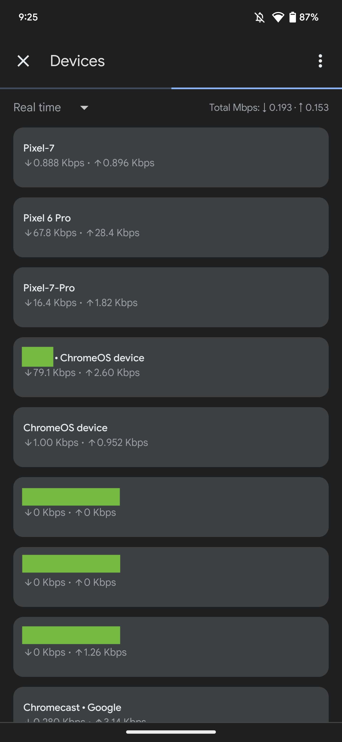 Tapping the top-left corner opens a “Sort by” sheet that defaults to “Real time” as “Total Mbps” appears opposite. There’s also the ability to see 1 day, 7 days, and 30 days, with Google Home now noting the precise date range. Compared to before, there’s a dedicated “Connection Strength” option that’s “updated every 5 seconds” and uses a three-bar Wi-Fi indicator: