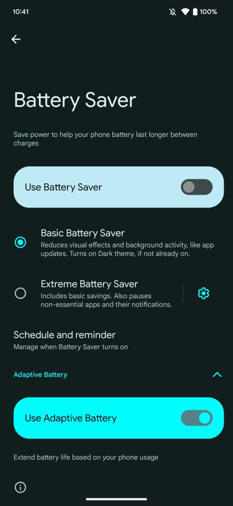 - You now choose between “Basic” and “Extreme Battery Saver,” with everything now on one page, including Adaptive Battery.