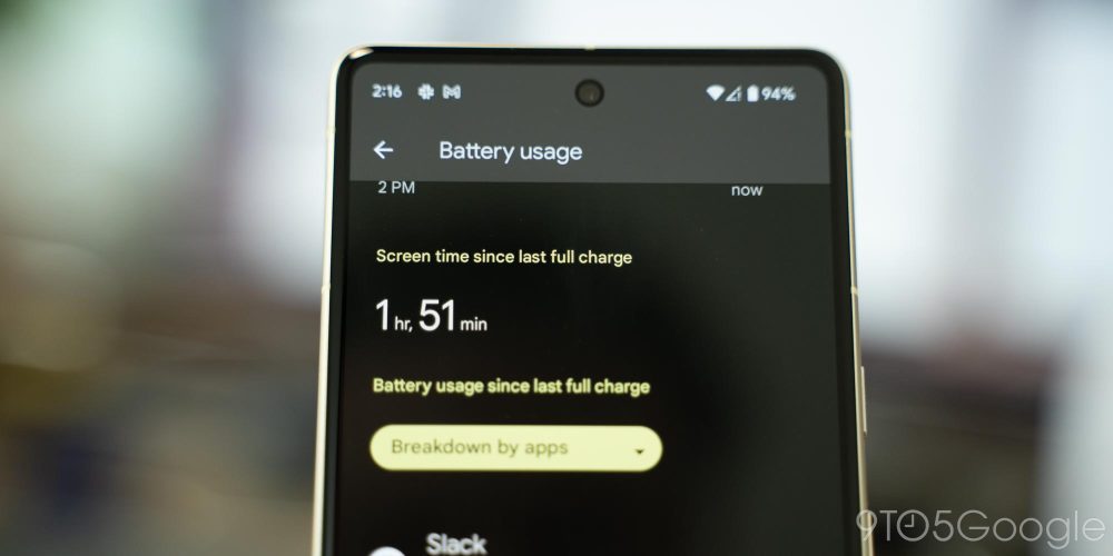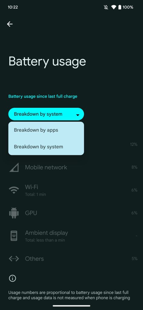- Instead of an inline dropdown, Battery usage now makes use of a menu to switch between “Breakdown by apps” and “Breakdown by system.”