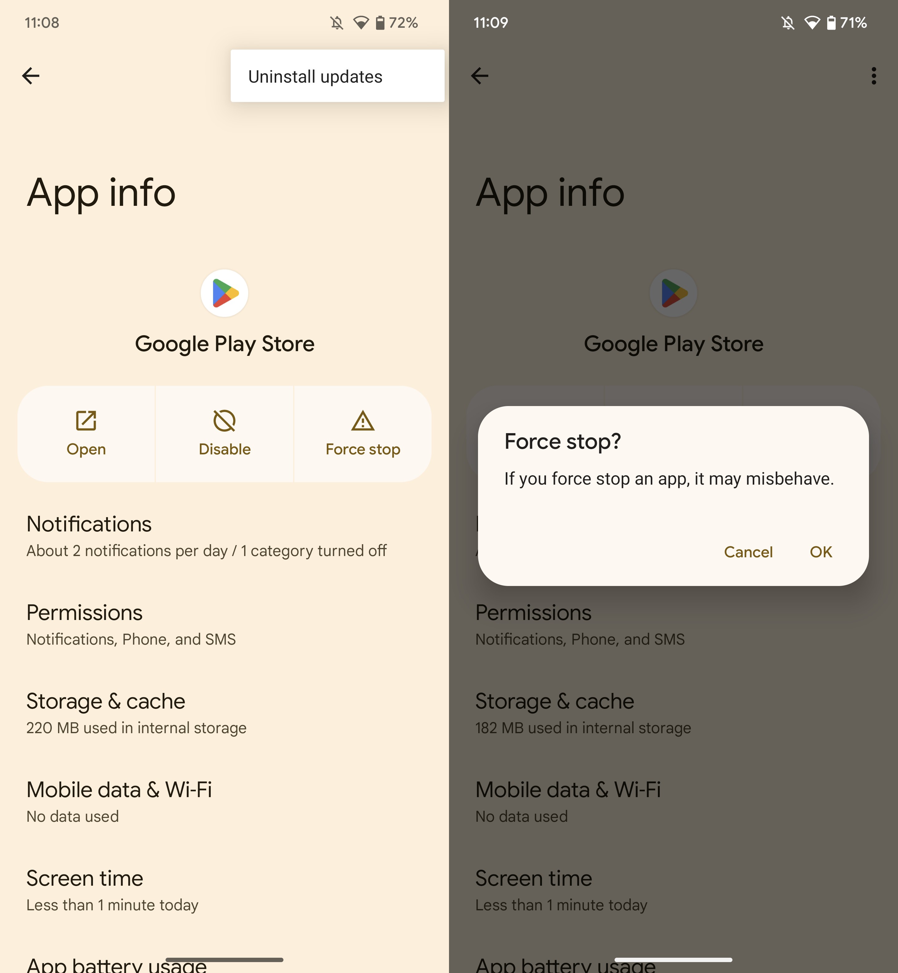 Once enabled, a handful of individual pages in the Android 14 Settings app are automatically swapped over to their Compose counterparts. Most of the time, though, you likely won’t notice that anything has changed. The easiest way to check is to tap a three-dots button to see if the dropdown menu has changed or if the color palette is slightly different, as shown below.