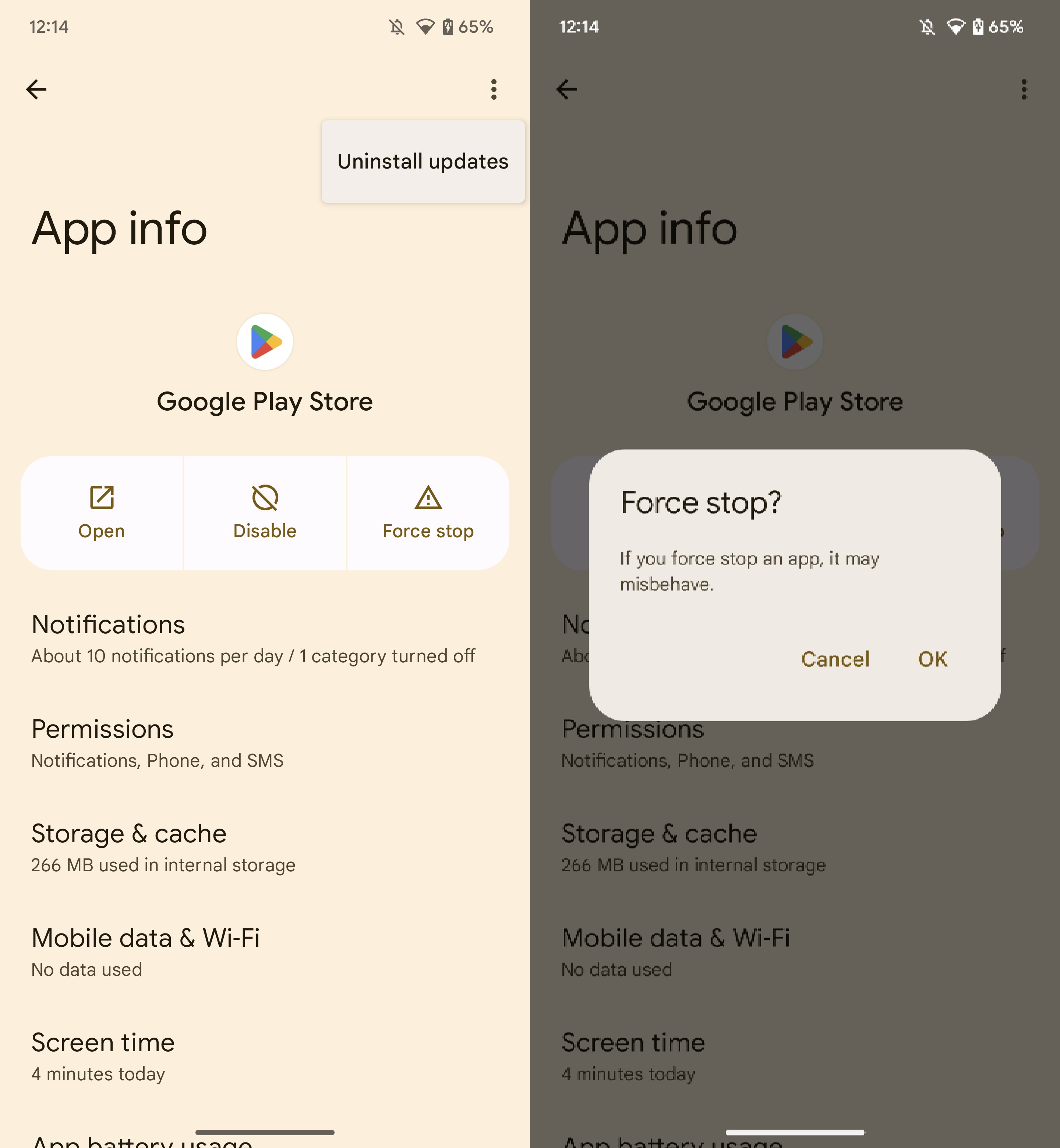 Once enabled, a handful of individual pages in the Android 14 Settings app are automatically swapped over to their Compose counterparts. Most of the time, though, you likely won’t notice that anything has changed. The easiest way to check is to tap a three-dots button to see if the dropdown menu has changed or if the color palette is slightly different, as shown below.