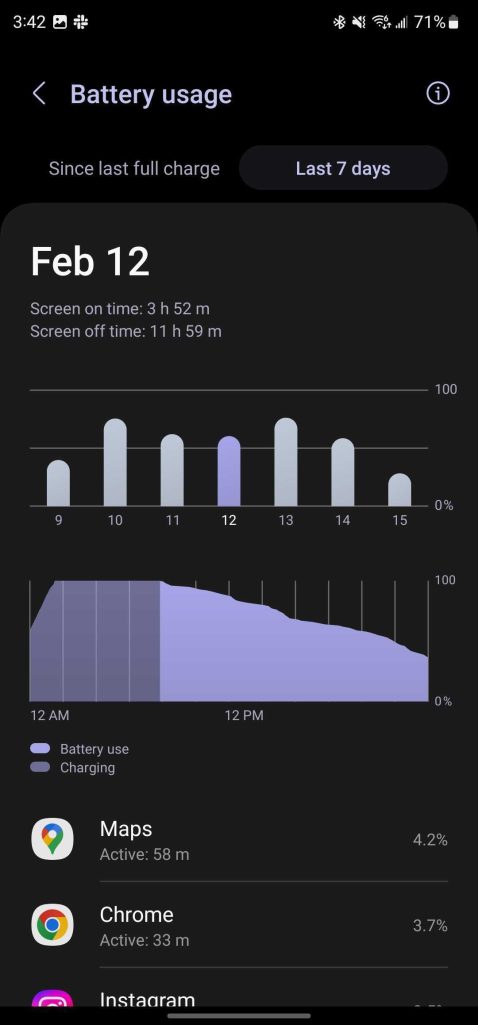 I pulled four consecutive days from my past week of Galaxy S23 Ultra usage (the second week of using the device, meaning it’s had time to learn my patterns), and averaged around 15 per day of use, with 4 hours and 15 minutes of screen time on average. Throughout that whole week, the lowest battery level I saw before going to be was 25% after just shy of 16 hours of use and 4 hours and 30 minutes of screen time. That day was full of 5G and LTE use, as well as a lot of running Google Maps via wireless Android Auto. Another heavy day saw just shy of 6 hours of screen time with around 30% left at bedtime.