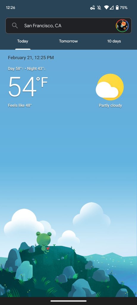 Meanwhile, the experience, which is part of and updated by the Google app, lacked a dark theme. This wasn’t that noticeable on initial glance since the Froggy illustration takes up the entire screen. However, scrolling up or switching to the other tabs reveals the light background.