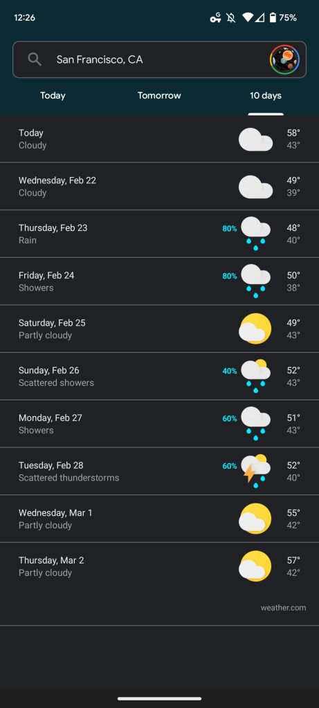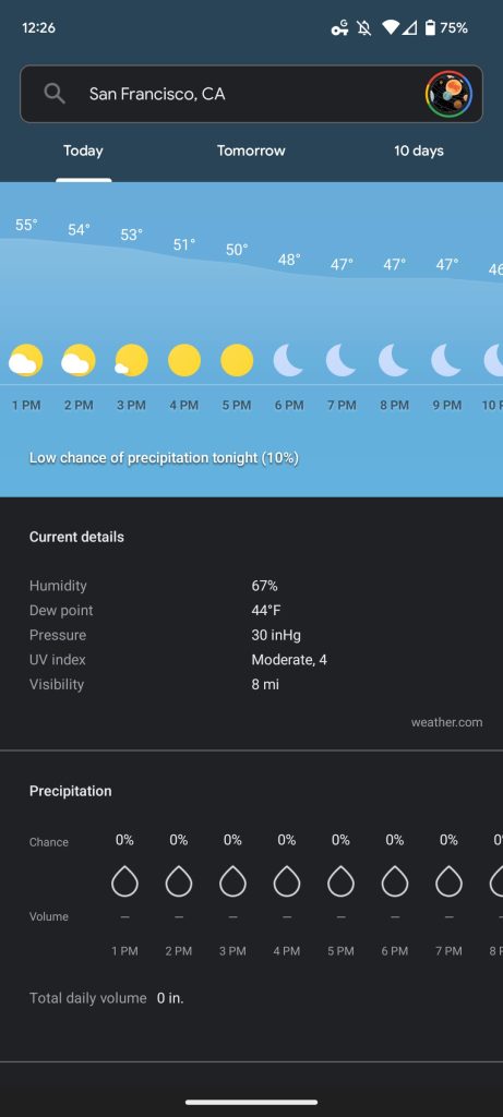 Curiously, after updating to the latest version of Android System Webview from the Play Store today, Google Weather has a dark theme that updates the search field, Current details, Precipitation, Wind, Sunrise & sunset, Tomorrow, and 10 days.