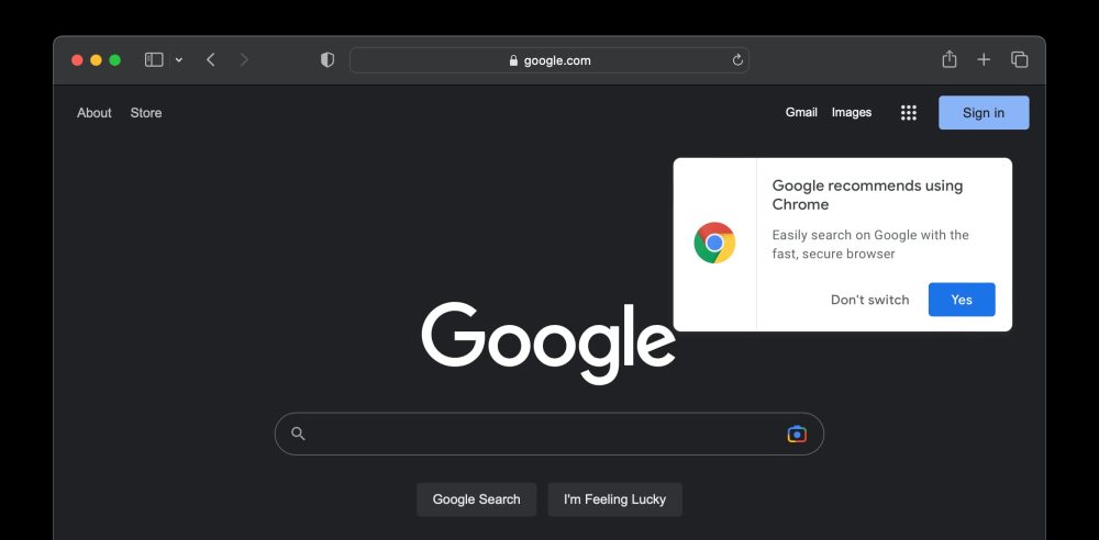 For its part, Google also tries to get people to use Chrome, but it’s not as aggressive. If you open Google Search in Safari for Mac, you’ll see a corner pop-up that says “Google recommends using Chrome.” The key diffidence is that this advertisement is occurring on a website Google owns.