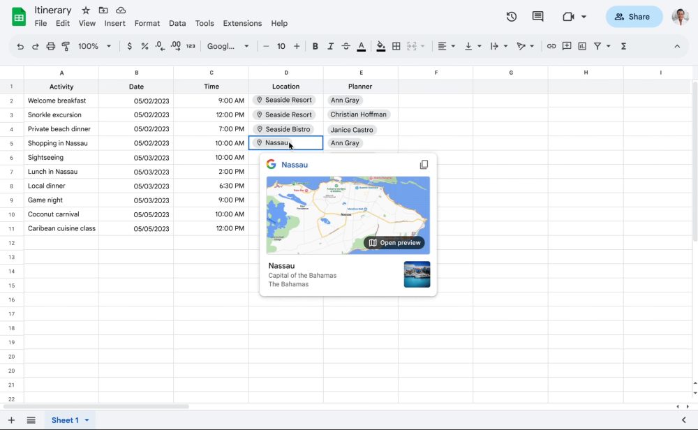 Moving away from Docs, Google Sheets is getting a Finance chip that lets you insert stocks, mutual funds, currencies, and other entities from Google Finance. Just @ and enter a company, stock ticker, or currency. Additionally, the Google Maps preview, @today, @yesterday, @tomorrow, and @date chips are now coming to Sheets.