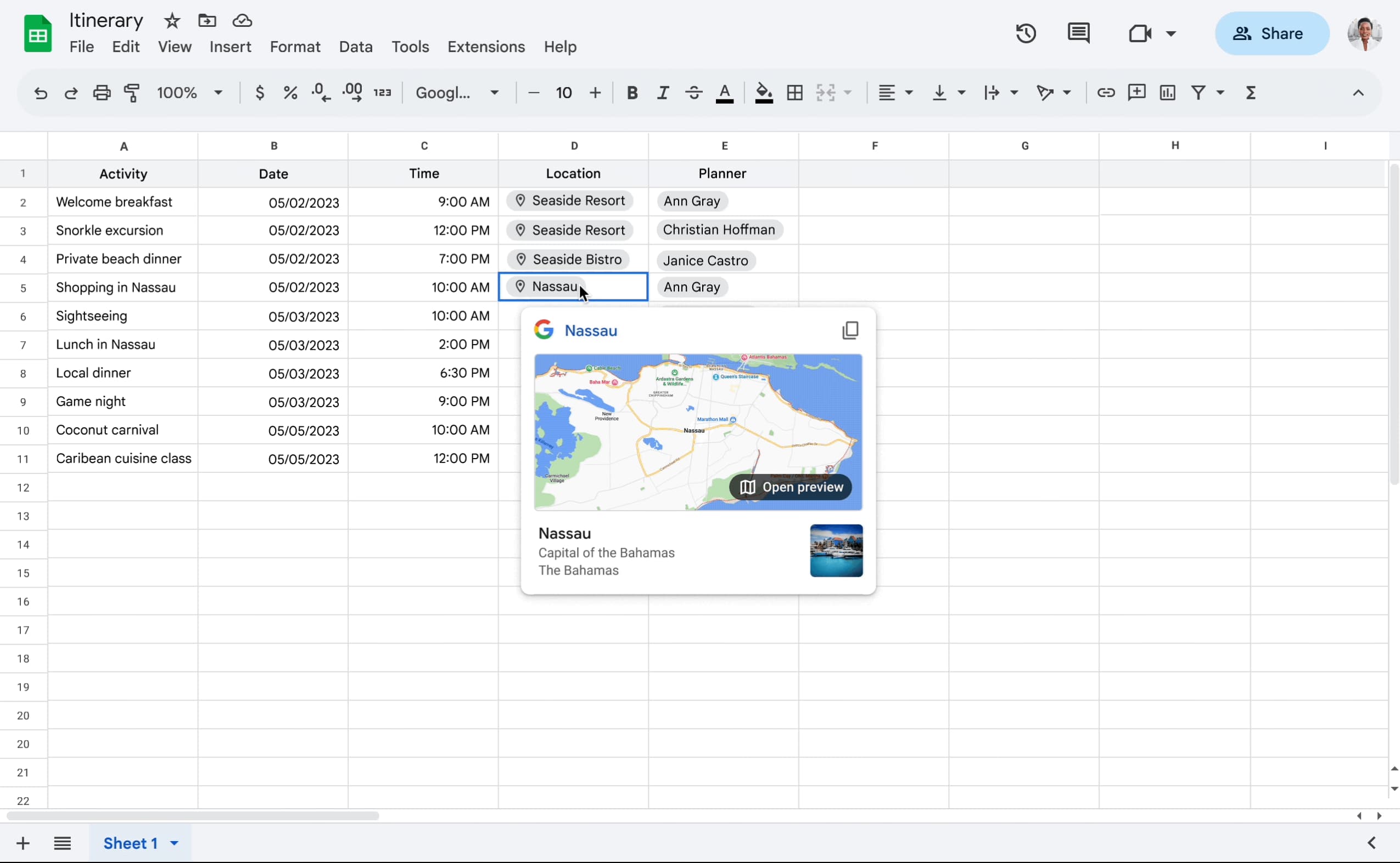 Moving away from Docs, Google Sheets is getting a Finance chip that lets you insert stocks, mutual funds, currencies, and other entities from Google Finance. Just @ and enter a company, stock ticker, or currency. Additionally, the Google Maps preview, @today, @yesterday, @tomorrow, and @date chips are now coming to Sheets.