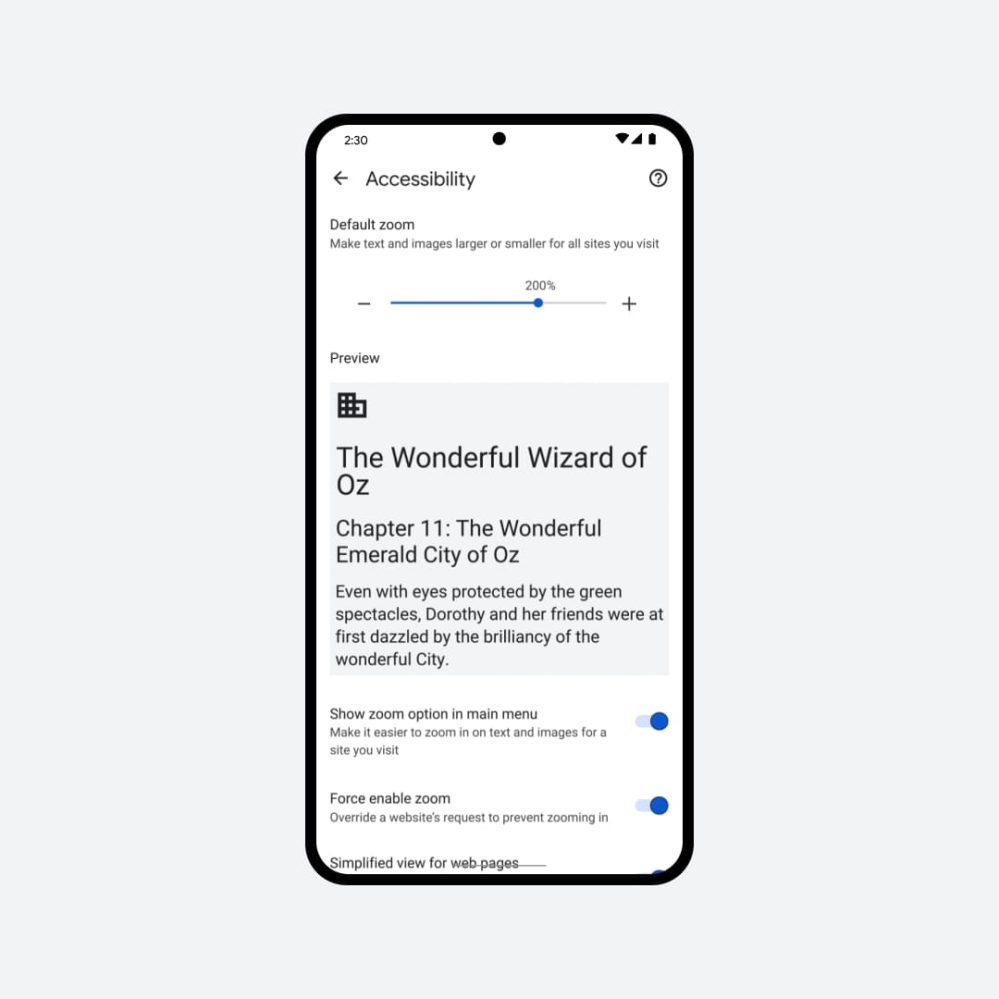 Meanwhile, Chrome for Android will let you increase the size of text, images, video, and other controls by up to 300% to “suit your vision preferences while still preserving the page layout.” On Pixel phones, it currently goes up to 200%. Settings > Accessibility will show a better text preview and a “Show zoom option in main menu” setting.