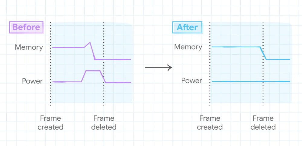 - Fine tuning iframes: “…we fine-tuned the garbage collection and memory compression heuristics for recently created iframes. This results in less energy consumed to reduce short-term memory usage (without impact on long-term memory usage).”