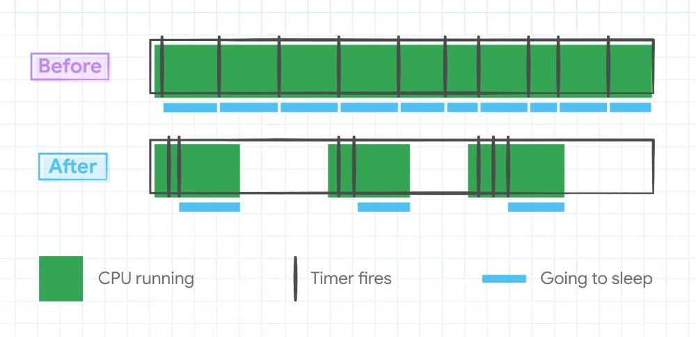 - Tweaking timers: “…Javascript timers still drive a large proportion of a Web page’s power consumption. As a result, we tweaked the way they fire in Chrome to let the CPU wake up less often. Similarly, we identified opportunities to cancel internal timers when they’re no longer needed, reducing the number of times that the CPU is woken up.”