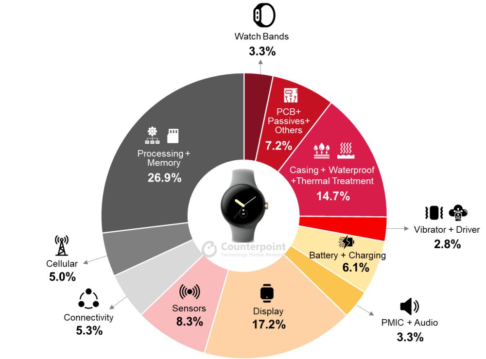 The difference between the retail cost of the Pixel Watch and the cost of its raw materials isn’t particularly large, either. Counterpoint highlights that the cost of the Pixel Watch is “a big leap” from previous Fitbit smartwatches. There’s no public mention of how much it costs Fitbit to make smartwatches such as the Sense or Versa, but they retail at $299 and $229 respectively. Counterpoint also previously published a BoM analysis for the OnePlus Watch, citing the cost at $68 while the wearable retails for $159. Much of the difference in the BoM versus the retail cost comes down to marketing as well as R&D costs.