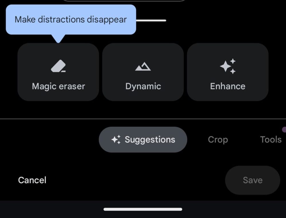When viewing an image in Google Photos, a suggestion chip will appear at the bottom when Magic Eraser detects things to remove. In the editor, you can find Magic Eraser in the “Suggestions” or “Tools” tabs. You can undo removals at any time.
