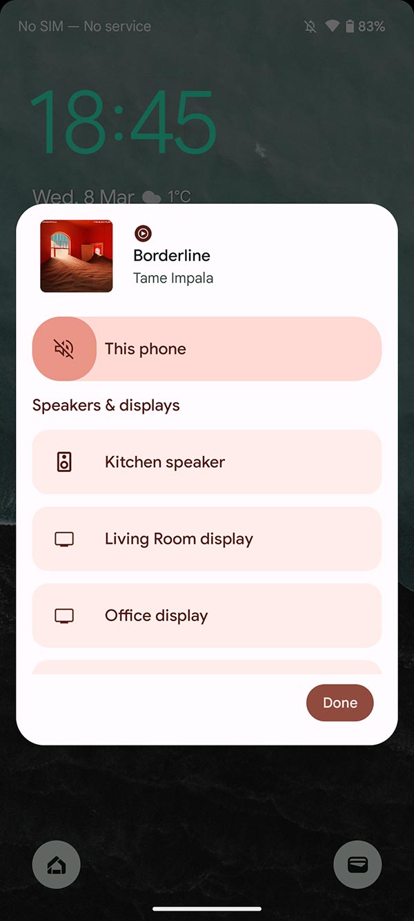 The changes continue with the media output switcher. This area will now show any nearby or available speakers and Cast-enabled devices; what’s more, the volume control slider now has a new icon to indicate that audio is muted on your device.