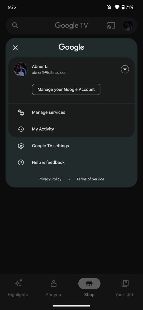 Elsewhere, Google TV’s switcher was just updated (4.39) to the latest version with Dynamic Color. Settings and Help & feedback are part of the background container, while items related to your account are grouped together.