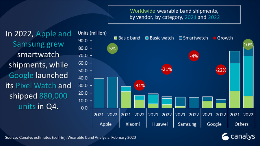 Canalys reports that Google shipped 880,000 Pixel Watch units in Q4 2022, the first three months that the smartwatch was available for sale. It was enough to help Google keep the second-place slot in the smartwatch market with 8% of the total shipment volume. That’s behind Apple’s commanding lead of nearly 28% and well above Samsung’s 5.9% share.