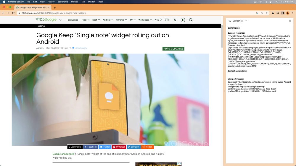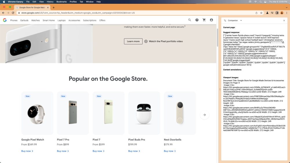 Specifically, Chrome is currently concerned with the web page’s title and the images that are visible on screen, as well as the current set of “trending searches” that Chrome’s address bar can display. The Search Companion feature then sends all of this information to a web app, which is set to be part of Google Lens, based on a “staging URL” found in code. We’ve managed to enable a very early preview of Search Companion, which only shows the data that would normally be sent.