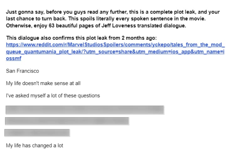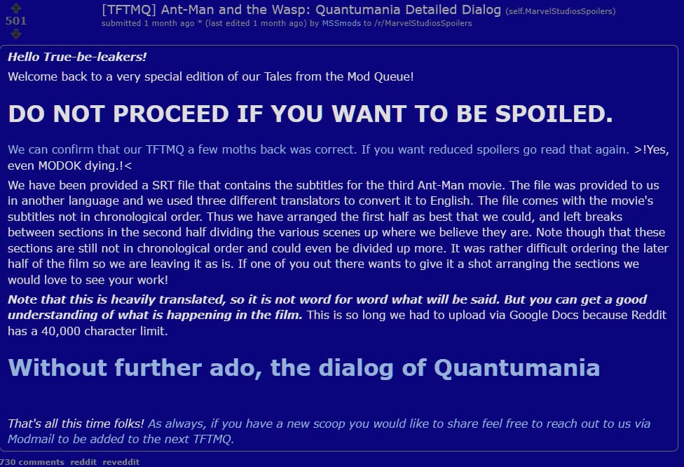 This document was subsequently posted to r/MarvelStudioSpoilers by the subreddit’s moderators. (Google Docs was used in the first place as Reddit posts have a 40,000 character limit.) That post says the document “contains the subtitles for the third Ant-Man movie. The file was provided to us in another language and we used three different translators to convert it to English.”