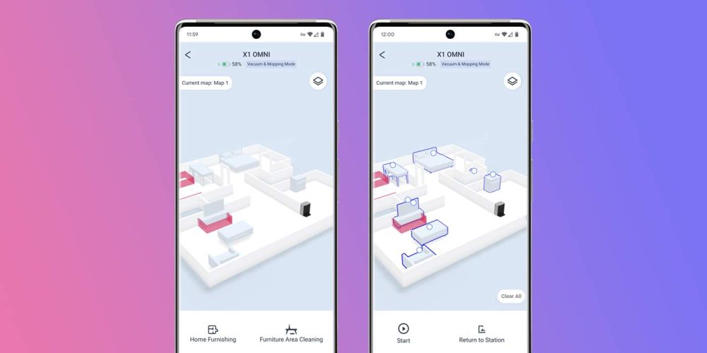 The X1 Omni benefits from having AIVI 3D, which is Deebot’s AI-driven camera setup. Rather than relying solely on LIDAR or other sensors, the X1 Omni has an actual camera that works to detect objects, such as furniture, toys, food, and even dog poop. With that, the vacuum is able to take in data and interpret it into several maps. One is the normal, top-down map, which lets you see and set boundaries. The other is a full 3D map, with detected furniture rendered into existence. With that, you can have the X1 Omni clean under the furniture by either asking it to do so with the voice assistant or opening that 3D map in the app.