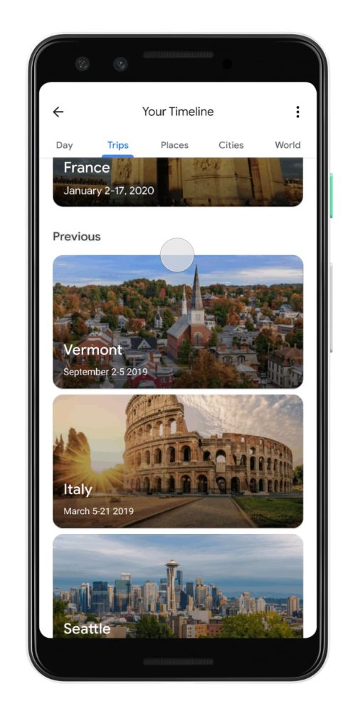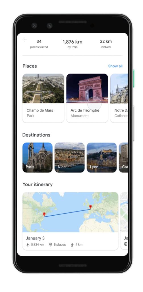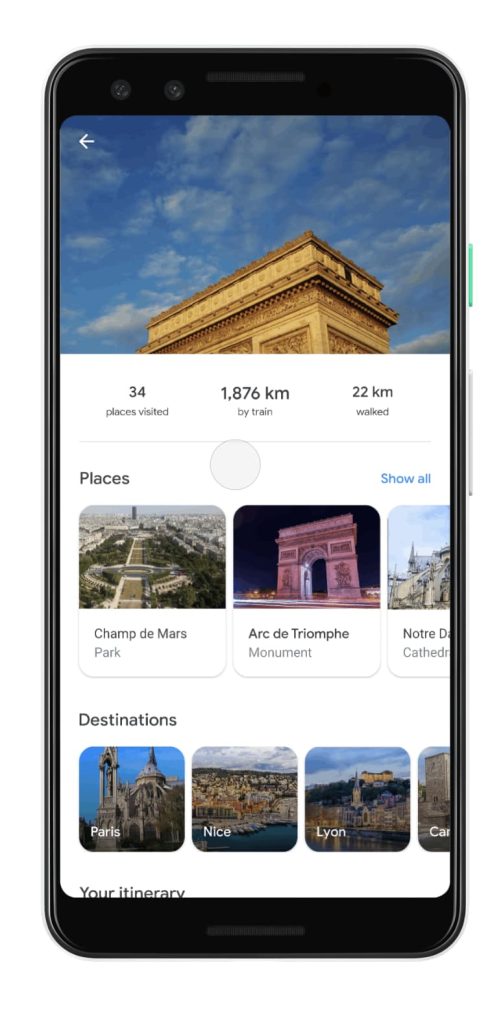 You see a similar list of past places you’ve visited, but each lacks the timeline functionality. Rather, you get carousels of visited places, destinations, your daily itinerary plotted on a map, and the ability to see your images from Google Photos.