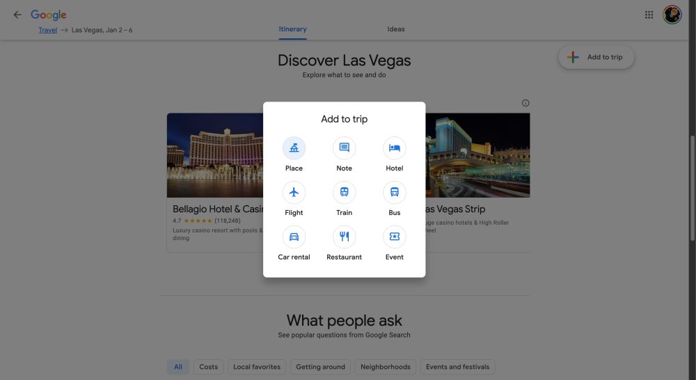 Besides what appeared from Gmail confirmations, you could manually add places, notes, hotels, flights, trains, buses, car rentals, restaurants, and events to a trip. These summaries also provided “Discover” suggestions and surfaced “What people ask” by costs, local favorites, getting around, neighborhoods, and events/festivals, as well as travel articles from the web.