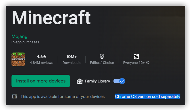 Interestingly, and unlike most Android apps on ChromeOS, Minecraft will require a separate purchase for the platform. You’ll only be able to do this from your Chromebook, assuming it meets the required specs, and costs roughly twice as much as the Android version which runs $6.99. Players who don’t own the Android version already will need to pay $20 for the two licenses, while those who already own Minecraft on Android can get the Chromebook upgrade for $13.