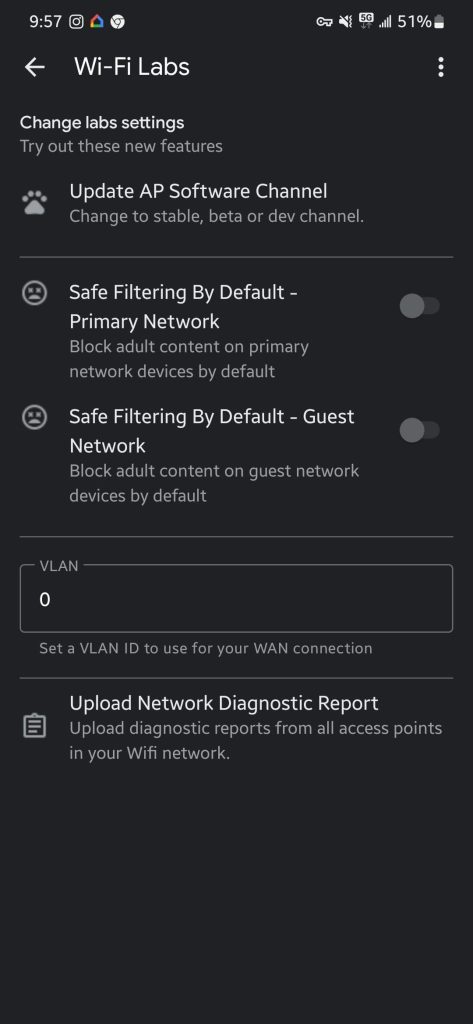 There’s also a “VLAN” (virtual local area network) field and the ability to “Upload diagnostic reports from all access points in your Wifi network.”