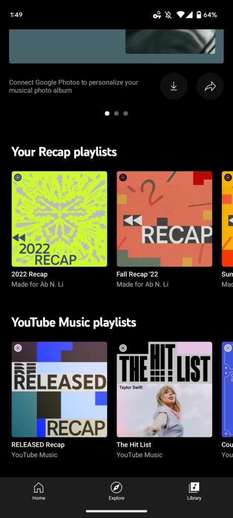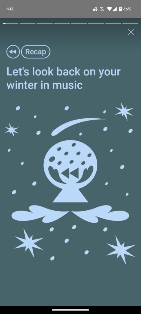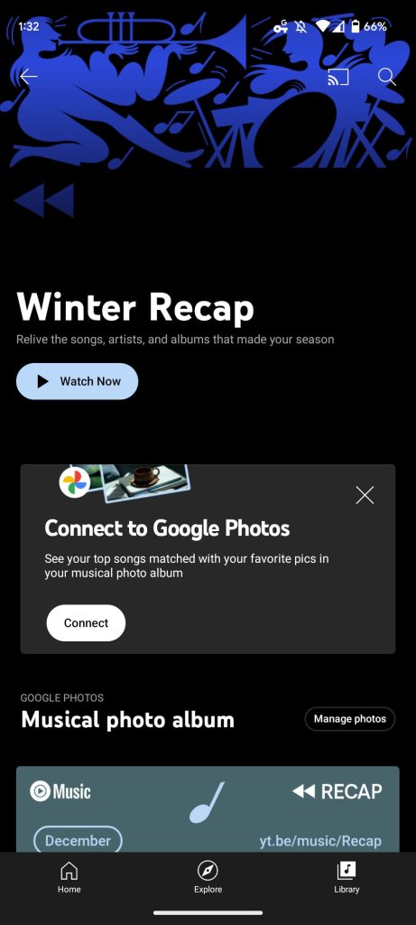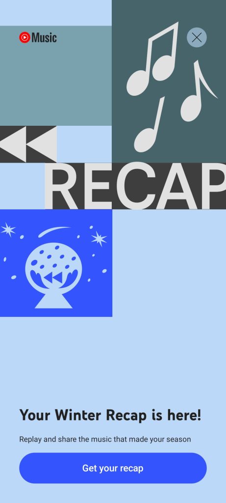 I’m not seeing the actual Winter Recap playlist right now. I just see carousels for previously-saved recaps and YouTube Music playlists. It’s possible that this feature isn’t fully rolled out.