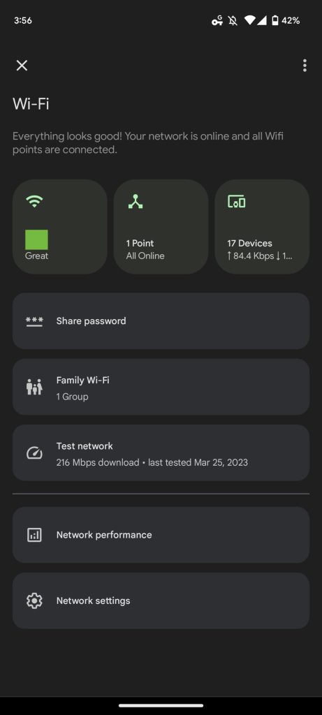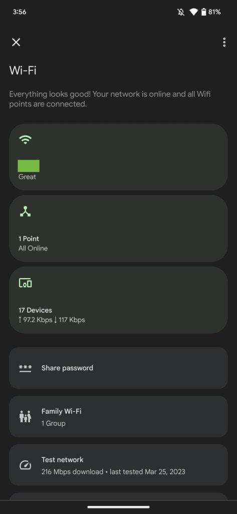 Meanwhile, on the Wifi page, Google Home previously displayed a row of tiles showing your network, number of points, and connected devices. The third tile also showed network download and upload rates, but the latter stat was often cut off.