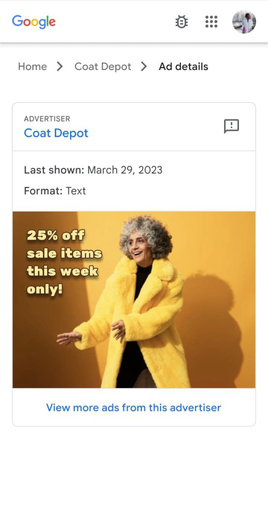 The Ads Transparency Center will let you view all the advertisements a company has run using Google’s networks. Each ad includes the date it last ran, format (text, video, etc.), and what region (country) it was shown in.